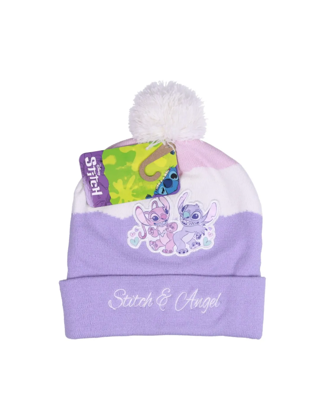 - Diseño: Presenta un adorable estampado de Stitch y Angel en tonos lilas y rosas, con un pompón blanco en la cima que añade un toque divertido y tierno.