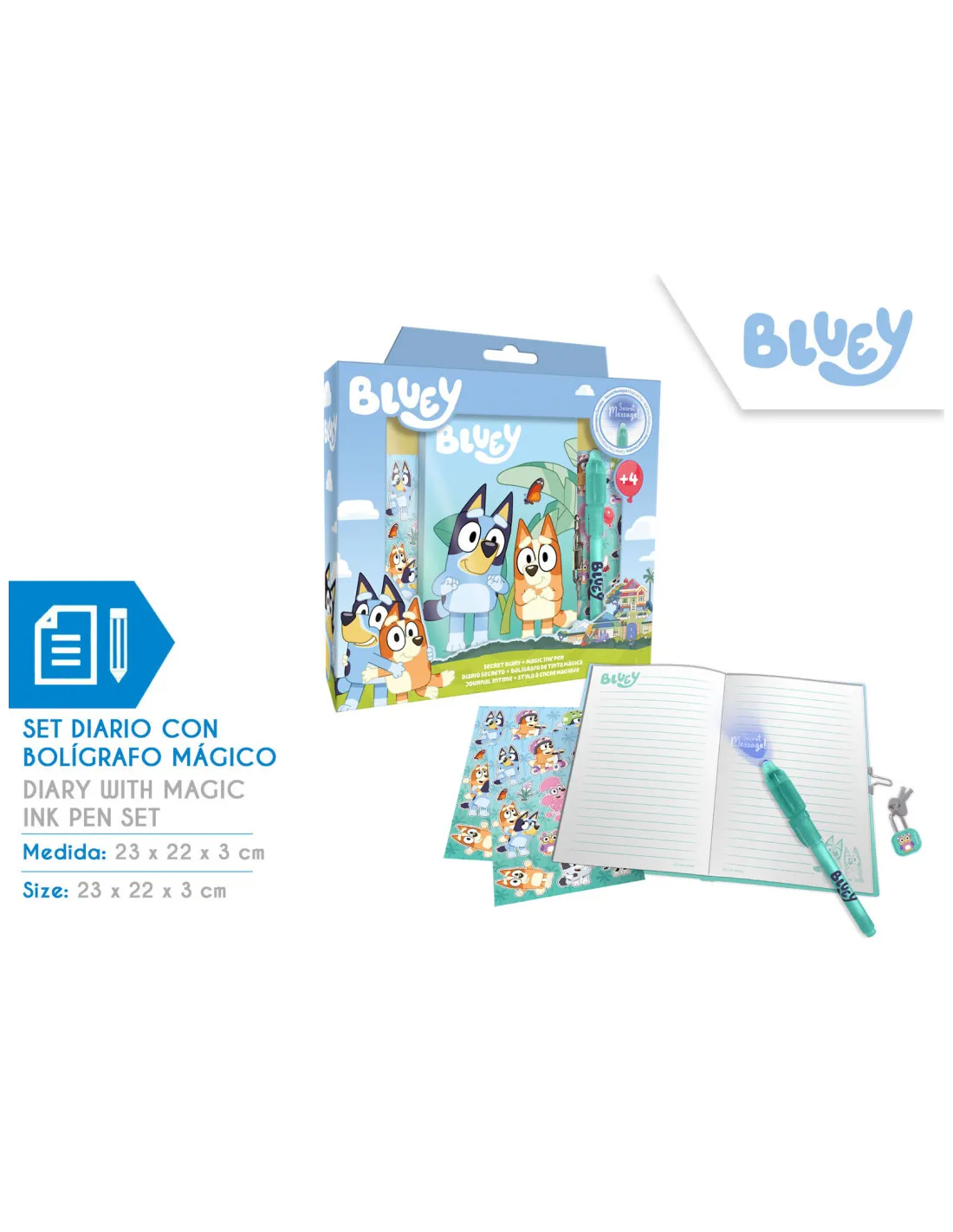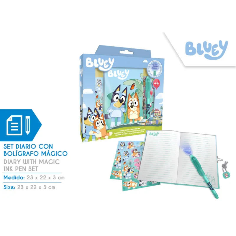 Sumérgete en el mundo de la creatividad y la diversión con el Set Diario Bluey con Bolígrafo Mágico, diseñado especialmente para despertar la imaginación de los más pequeños. Este encantador set no solo ofrece un espacio para escribir y dibujar, sino que también incluye un bolígrafo mágico que añade un toque de magia a cada página. Perfecto para niños que aman la aventura y la creatividad, este diario se convierte en el compañero ideal para explorar mundos de fantasía y guardar todos sus secretos y sueños.
