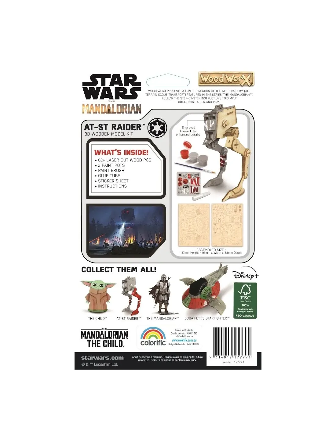 Sumérgete en el universo de Star Wars con el kit modelo 3D AT-ST Raider de Wood WorX, perfecto para fans de todas las edades. Este set no solo ofrece entretenimiento, sino que también despierta la creatividad y mejora las habilidades motoras finas. Construye, pinta y personaliza tu propio AT-ST Raider, garantizando horas de diversión y un resultado final que te llenará de orgullo. Ideal para coleccionistas y jóvenes constructores, este modelo promete ser el centro de todas las miradas.